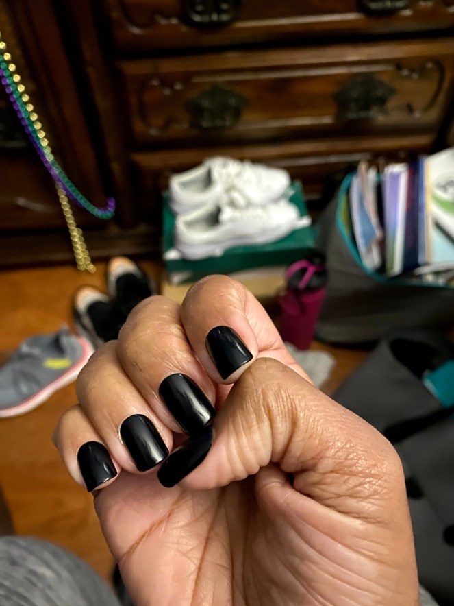 For me, I have decided that I am not too old to be girly. I have never had a desire to wear acrylic or press-on nails. Friends and influencers have shown how easy they are, so I bought the bait. I have had the short, black, glossy set of nails for MONTHS. Saturday night, I took the plunge and am so happy I did!
